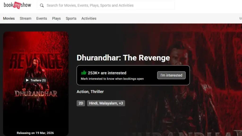 The Dhurandhar 2 page went live much later, likely in October or November 2025, as the first part of Dhurandhar was already on BookMyShow. Despite the shorter duration, the film has already achieved 244K interest, reflecting strong anticipation among fans. Interest continues to grow at a rate of roughly 1,000 new registrations per hour.